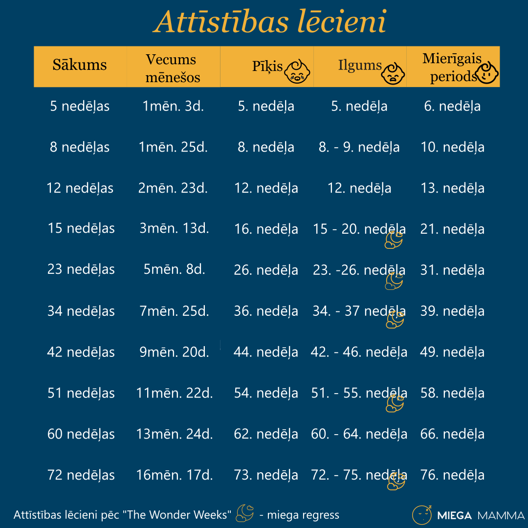 Daudzi speciālisti ir vienisprātis, ka visbiežāk regress notiek aptuveni 4 mēnešu, 6 mēnešu, 8 mēnešu, 12 mēnešu, 18 mēnešu un 2 gadu vecumā un ilgst 2 – 6 nedēļas. Tomēr ņemiet vērā – katrs bērns ir individuāls un arī miega regress var izpausties dažādi. Vienam ilgāk un spēcīgāk, citam - ātri un viegli. (lapas apakšā attēls - attīstības lēcieni kopā ar miega regresu laiku)